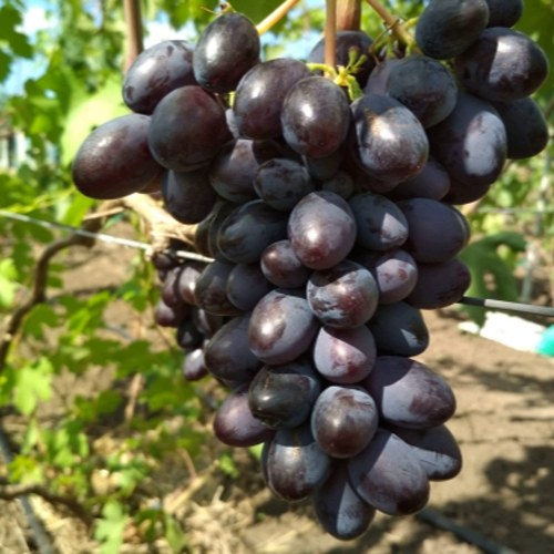 Грозди получаются крупными и нарядными: цилиндро-конические, средней плотности, весят 700–900 граммов, а при хорошем уходе легко переваливают за килограмм. Ягоды удлинённые, очень крупные — 15–20 граммов (до 23 г), размером примерно 18×48 мм. Цвет насыщенный тёмно-синий или тёмно-фиолетовый с красивым сизым налётом — такие грозди выглядят потрясающе на рынке и на столе. Мякоть плотная, хрустящая, мясистая и сочная. Вкус чистый, гармоничный, сортовой — сахар набирает высоко (около 20 %), без лишних оттенков. Кожица плотная, но легко съедается, почти не чувствуется. Косточки есть (1–2 штуки). Ягоды крепко держатся, не трескаются после дождя и отлично переносят перевозку.